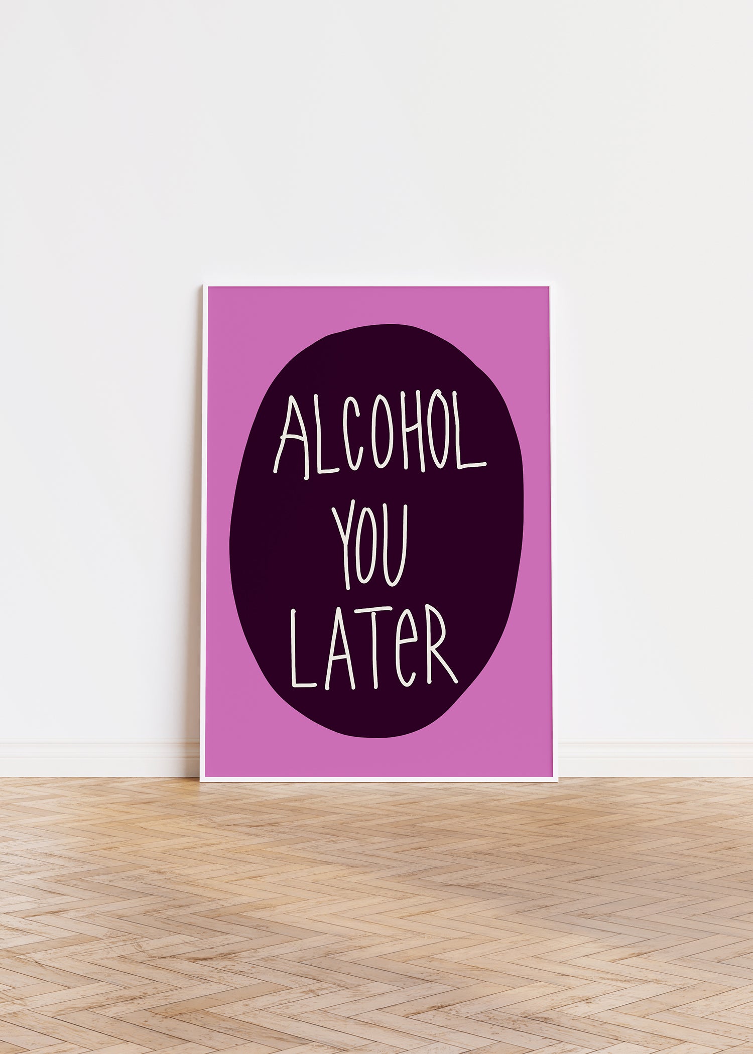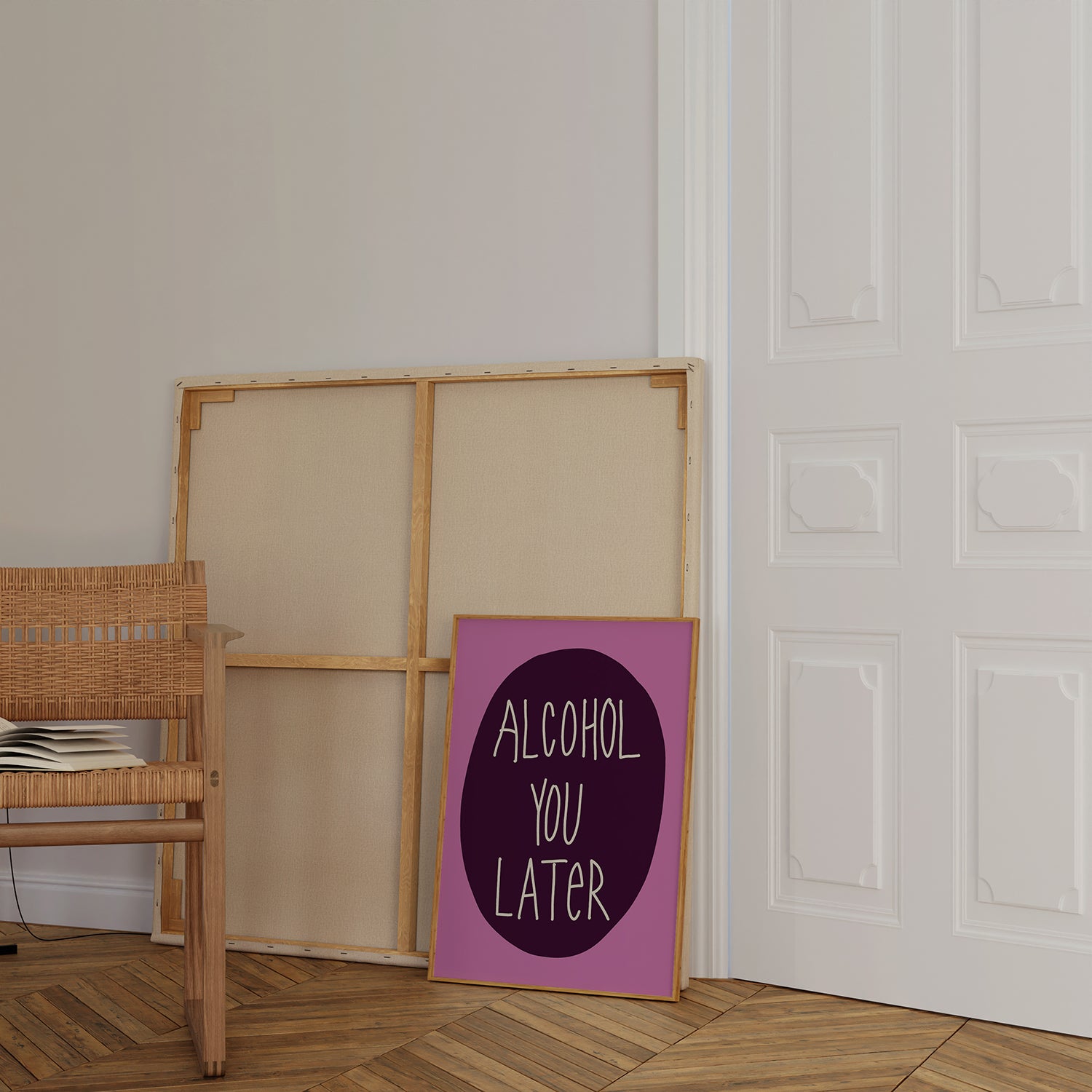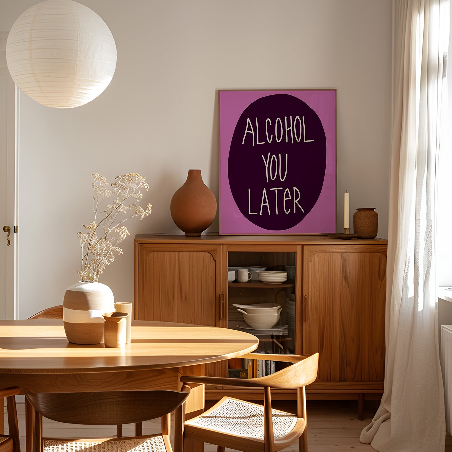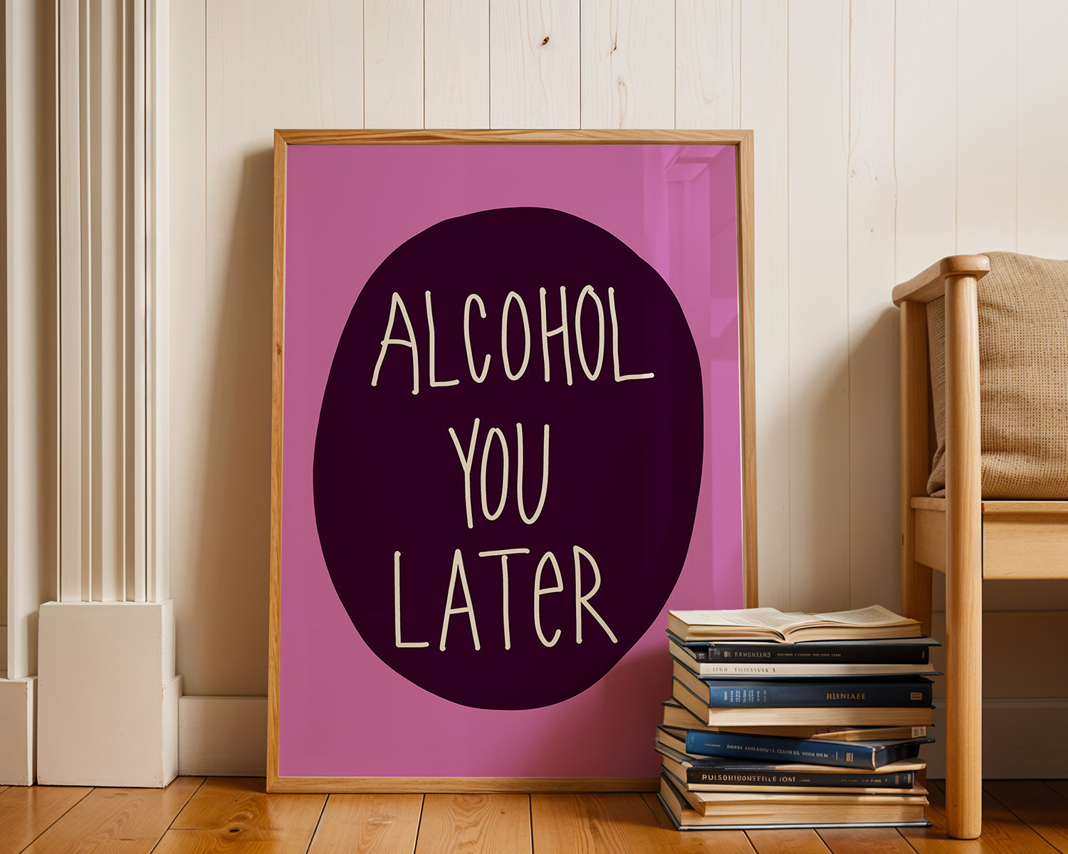 Add a splash of sass to your space with this “Alcohol You Later” poster — the perfect finishing touch for your bar cart, kitchen, or cocktail corner. This bold and witty wall art brings playful energy to happy hour and makes a hilarious gift for wine lovers, party hosts, or your favorite drinking buddy. Printed on matte paper with crisp typography and a vibrant pink and plum color palette, it’s equal parts cheeky and chic.